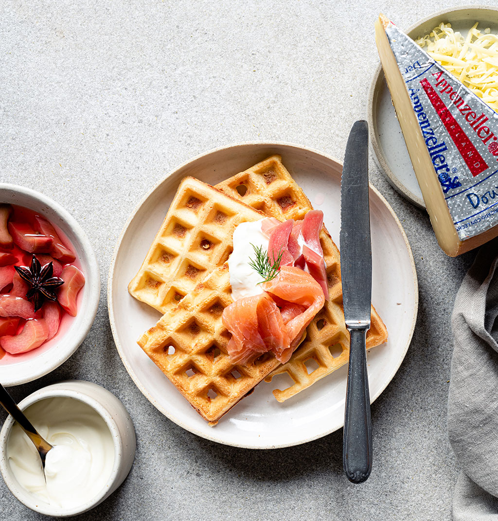 Cheesy Waffles with Appenzeller® Silver Label, Pickled Rhubarb & Smoked Salmon