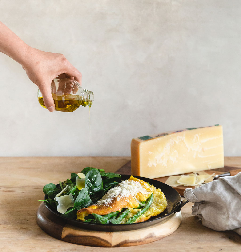 Serve the omelette with a salad of young spinach leaves and a few shavings of Sbrinz AOP plus a drizzle of olive oil.