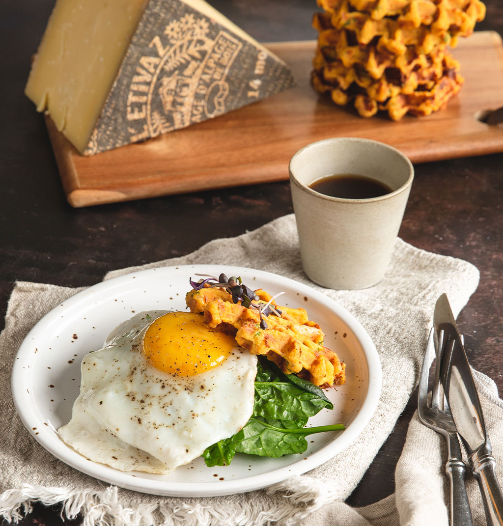 Serve the waffles with a salad of baby spinach leaves and a fried egg.