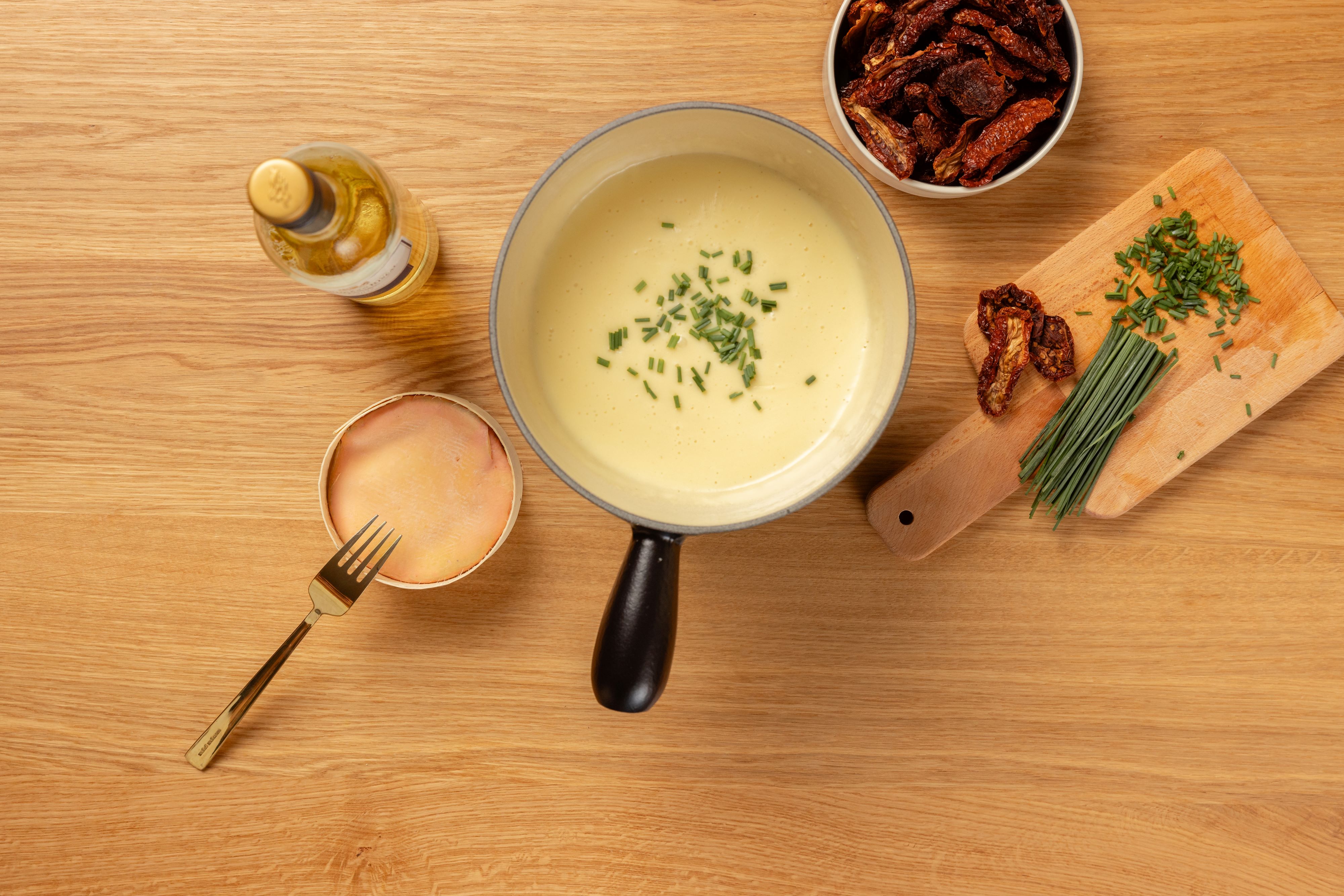 Ein feines Bauernbrot hergestellt mit Weizen, Roggenmehl und Frischmilch passt ausgezeichnet zu diesem Fondue, das mit verschiedenen Schinken angereichert wird. Geschmacklich überzeugt das Bauernbrot mit seiner feinen ausgewogenen Säure und der malzig, nussigen Note. Die fluffige Krume und die zarte Kruste sind eine wunderbare Ergänzung zum Fondue Moitié-Moitié.