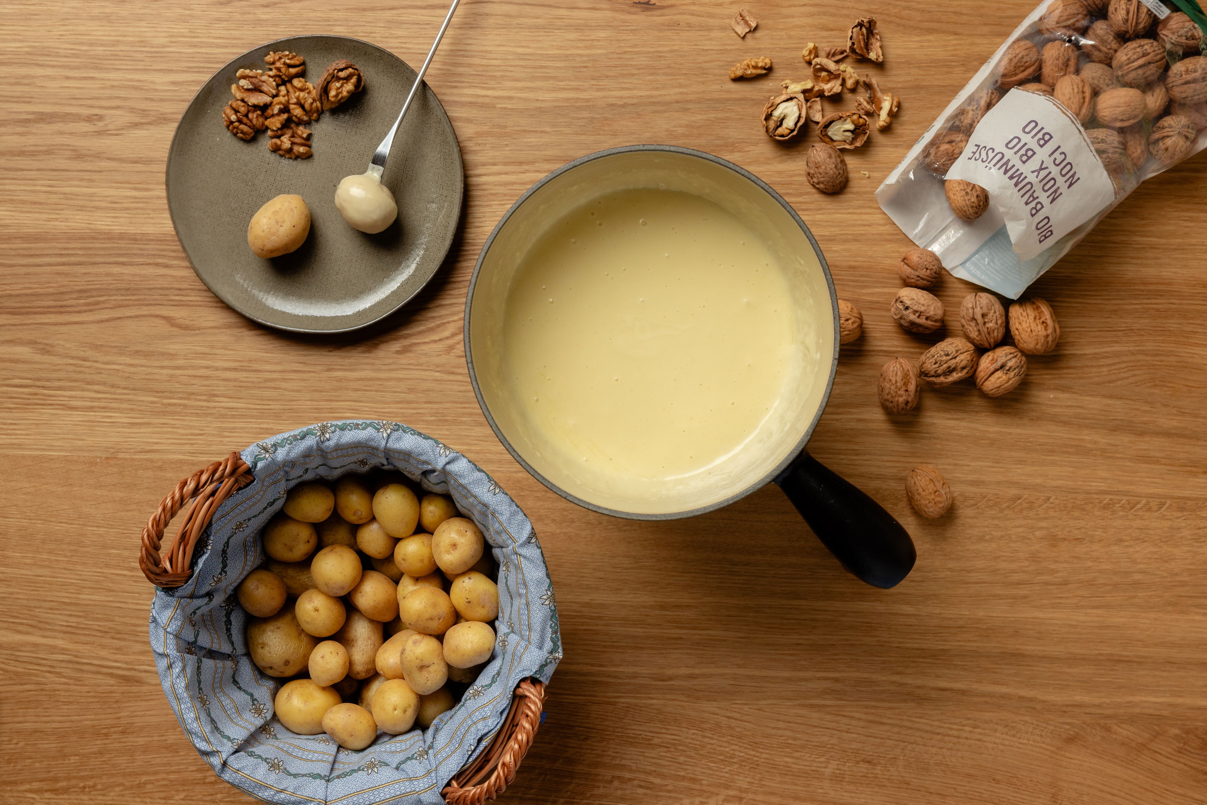 Das Waadtländer Fondue, das aus einer Vielzahl von Gruyère Käsesorten besteht, verlangt nach einem Brot, das die würzigen Nuancen ausgleicht. Genau diesen Ausgleich verspricht das Kartoffel-Baumnussbrot. Die Krume ist vollgespickt mit Baumnuss- und Kartoffelstückchen, die in Verbindung mit dem geschmolzenen Käse eine unvergessliche Gaumenfreude kreieren.