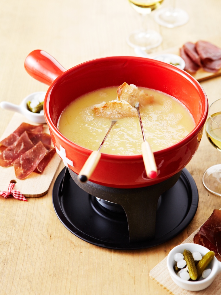 Strofinare le pareti interne del caquelon con lo spicchio d’aglio. Mescolare il Gruyère DOP e la maizena, unire il vino bianco e il succo di limone e portare a ebollizione senza mai smettere di rimestare. Abbassare la fiamma, aggiungere il Vacherin Fribourgois DOP e rimestare fino a quando è fuso. Terminare aggiungendo il kirsch. Regolare con un po’ di pepe di Cayenna. Disporre il caquelon al caldo sopra il fornellino.