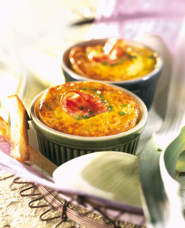 Haal ze uit de oven en laat ze vijf minuten afkoelen. Versier ze met de resterende bieslook. Serveer de flans in hun vorm en serveer met licht geroosterde soldaatjes.