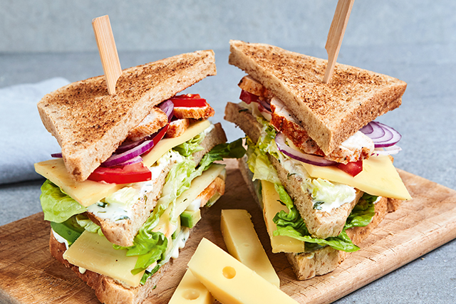 Para la primera capa del sándwich, meta entre dos rebanadas de pan tostado lechuga, aguacate, huevo y Appenzeller®. Para la segunda capa, meta también entre dos rebanadas de pan lechuga, Appenzeller®, tomate, cebolla y pollo.