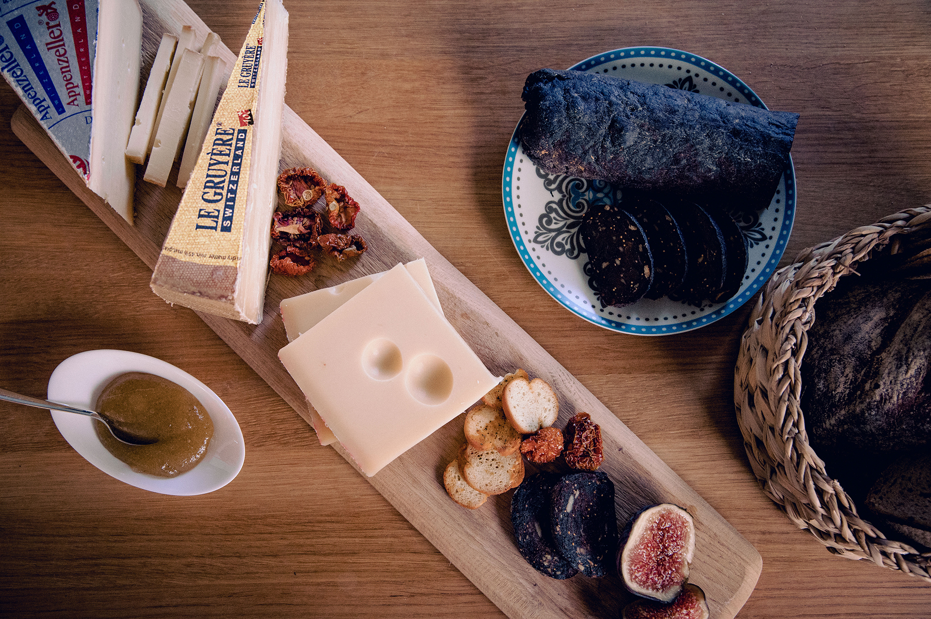 Hast du vielleicht verschiedene Schweizer Käsesorten und ein paar frische Beilagen wie Tomaten, Gurken oder eingelegte Gurken vorrätig? Dann lege sie auf eine Platte. Du kannst diese Dinge auch auf dem Heimweg von der Arbeit schnell besorgen, falls du sie nicht zu Hause hast. Ein paar Weintrauben, Nüsse und knuspriges Brot dazu.